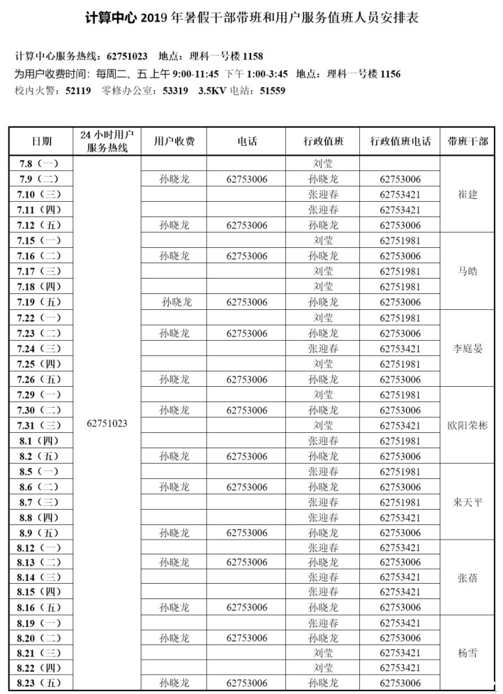 韦德国际bv19462019年暑假值班表